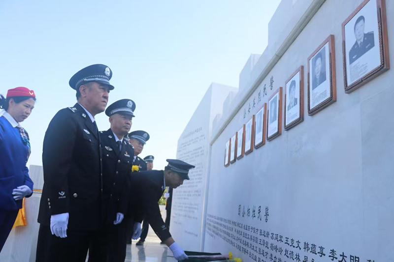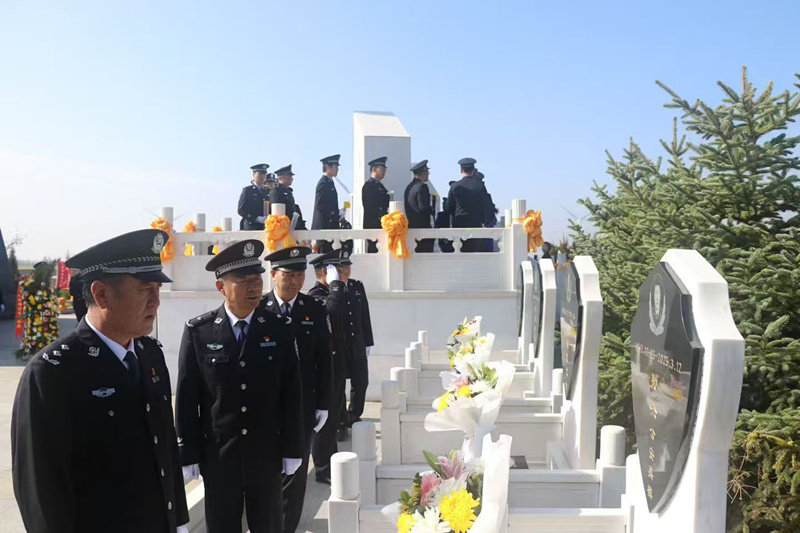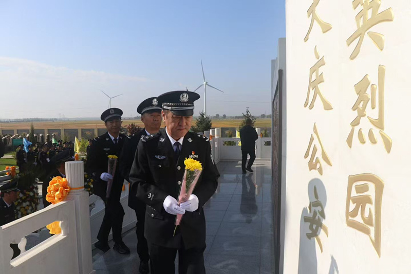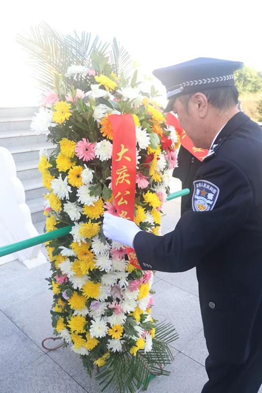 隨后,宋市長與全體公安干警在英烈園前舉行重溫入警誓詞,并向公安英烈花籃整理鍛帶,獻花致敬。宋市長引領全體公安干警圍繞英烈碑一周,并脫帽深深地向每個英烈逐個敬禮,以此懷念昔日戰友……