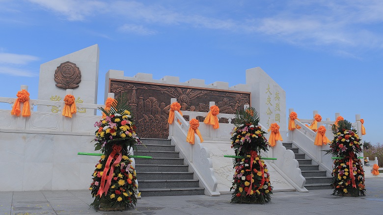 主體形象墻是英烈園的中心建筑,位于墓前廣場與英烈墓地之間,坐北朝南,由臺基、主題浮雕和兩翼劍型墻組成,整體呈中低側高之勢,猶如雄鷹振翅欲飛,寓示大慶公安銘記英雄、繼承遺志、發揚精神、勇創輝煌之意。兩側的劍型碑象征公安機關打擊違法犯罪和保障人民群眾生命、財產安全的兩把利劍。劍形碑與浮雕墻成15度角,劍尖直指蒼穹,彰顯了大慶公安的氣魄和力度。左側碑上刻有警徽圖案和“警魂”字樣,右側碑上刻有“大慶公安英烈園”的墓園名稱,兩碑的背面分別用中英文刻有大慶公安英烈園的墓志銘。形象墻最高處3.7米,寓意大慶公安成立至今37年。其中,臺基共8級臺階,寓意已犧牲的8名英烈;浮雕墻為長城形狀,寓意人民公安是國家和人民的鋼鐵長城;主題浮雕長9米,寓意英烈精神長久永存;高2.016米,代表2016年建成;浮雕正面由英烈形象、長城、油井等元素構成,彰顯大慶公安英烈舍生忘死、用血肉之軀保家衛國的英雄氣概;浮雕背面鐫刻已犧牲英烈的照片、個人自然狀況、英雄事跡及因公犧牲民警姓名,讓人們永遠牢記英雄的名字,銘記他們的感人功績!